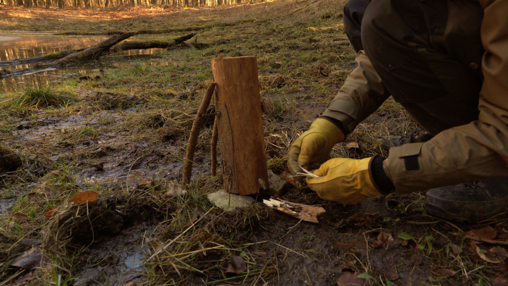 Now we come to the operation of the Rocket Stove. For this, we need tinder to get the flame so big that we can light the wood with it. For this, you can use the bark of the birch to light a flame with a few sparks from a fire steel. Chop up the birch bark a little and place it on top of additional tinder material. Old bark is suitable as a base to get the glowing nest into the combustion chamber. If you have fat wood, you can, of course, also use it.