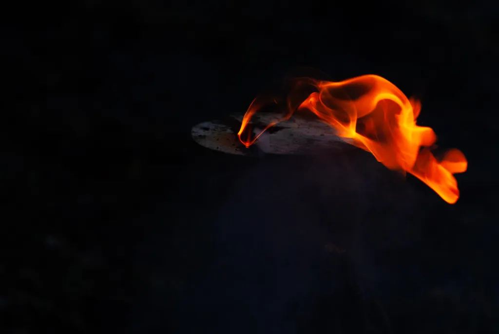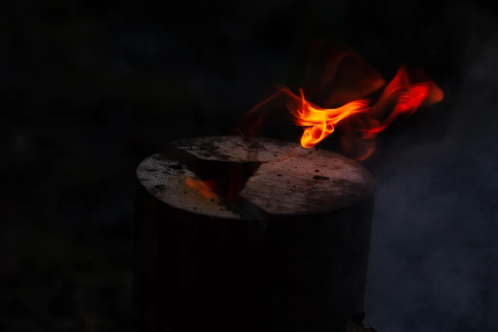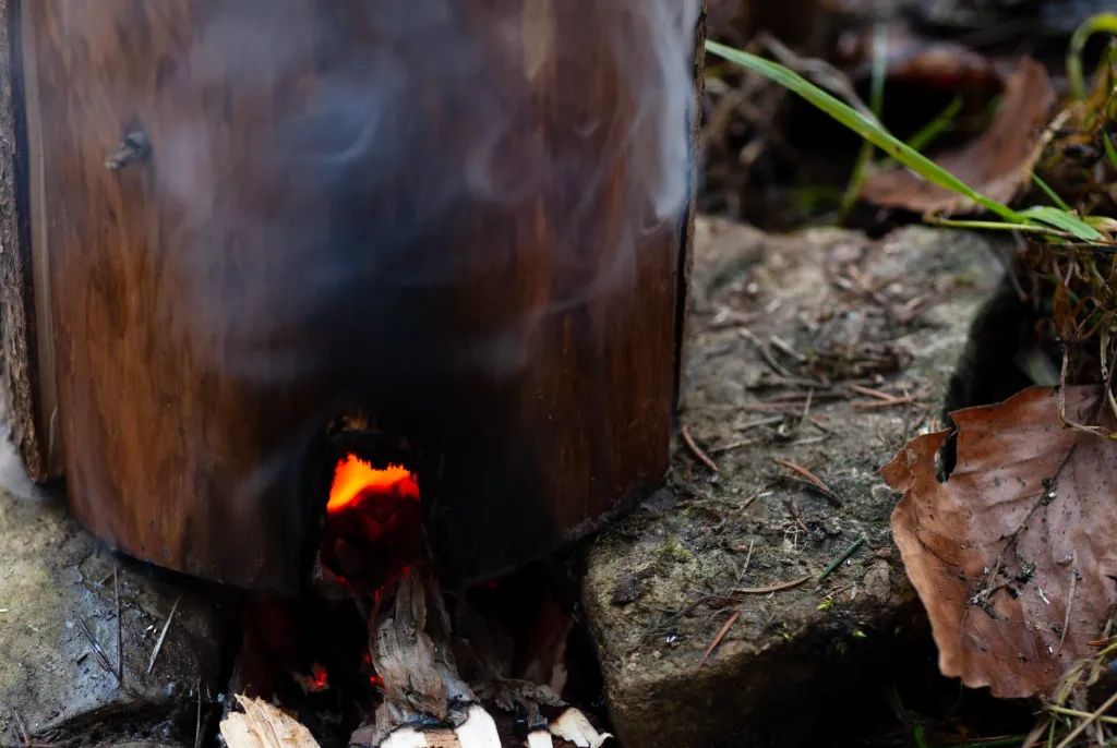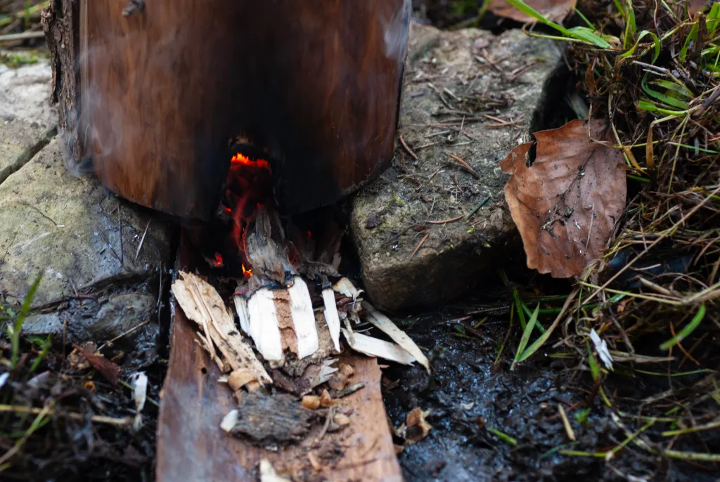 As soon as you have lit the fire on the bark underneath, you can use a stick to push the embers into the combustion chamber. The chimney effect should set in immediately and ensure a reasonably constant flow of fresh air. After a short time, the fire begins to rise along the chimney pipe. The resulting heat flows out of the opening and can be used immediately to heat food or water.