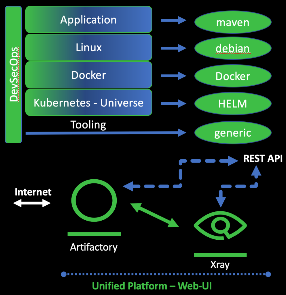 As an example, I would like to briefly show what a minimal technology stack can look like today. Java is used for the application itself, the dependencies of which are defined using maven. For this, we need access to maven repositories. Debian repositories [Why Debian Repos are mission-critical..] used for the operating system on which the application is running. The components that then packaged into Docker images use Docker registries, and finally, the applications orchestrated in a composition of Docker images using Kubernetes. Here alone, we are dealing with four different repository types. At this point, I have left out the need for generic repositories to provide the required tools used within the DevSecOps pipeline.