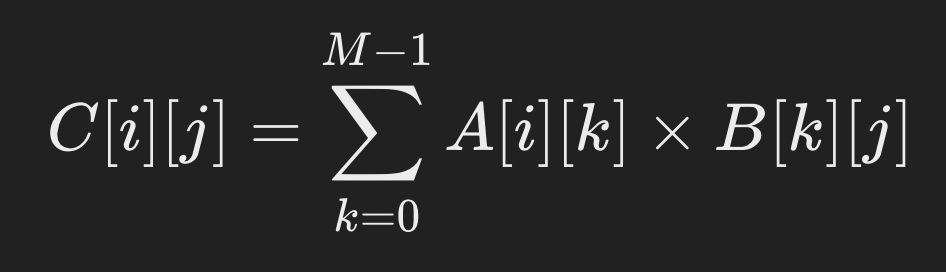 This operation involves a large number of independent computations, meaning that all elements of C can be computed in parallel. This is an ideal scenario for hardware acceleration using GPUs or FPGAs, which can perform a massive number of operations simultaneously.